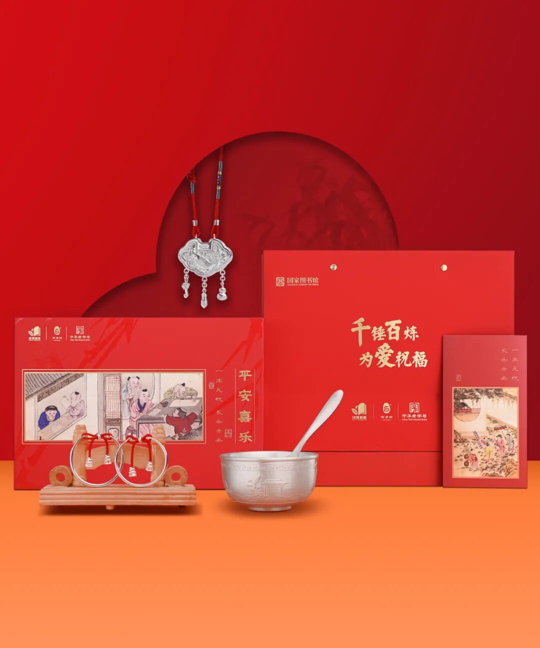 平安喜樂(lè)套裝,包含1只銀碗、1把銀勺、1對(duì)銀鐲、1個(gè)銀鎖。禮盒獨(dú)立包裝及產(chǎn)品創(chuàng)意設(shè)計(jì)過(guò)程中,融入國(guó)家圖書館藏典籍《百子團(tuán)圓圖冊(cè)》文化內(nèi)涵和圖案,通過(guò)傳統(tǒng)手工鏨刻,傳遞納西東巴“平安喜樂(lè)”的美好祝福,承載“魚躍龍門”的殷殷期盼。在匠人的一錘一鏨間,將親人的祝愿化為歲歲年年的陪伴,守護(hù)寶貝一生無(wú)憂、長(zhǎng)樂(lè)未央。